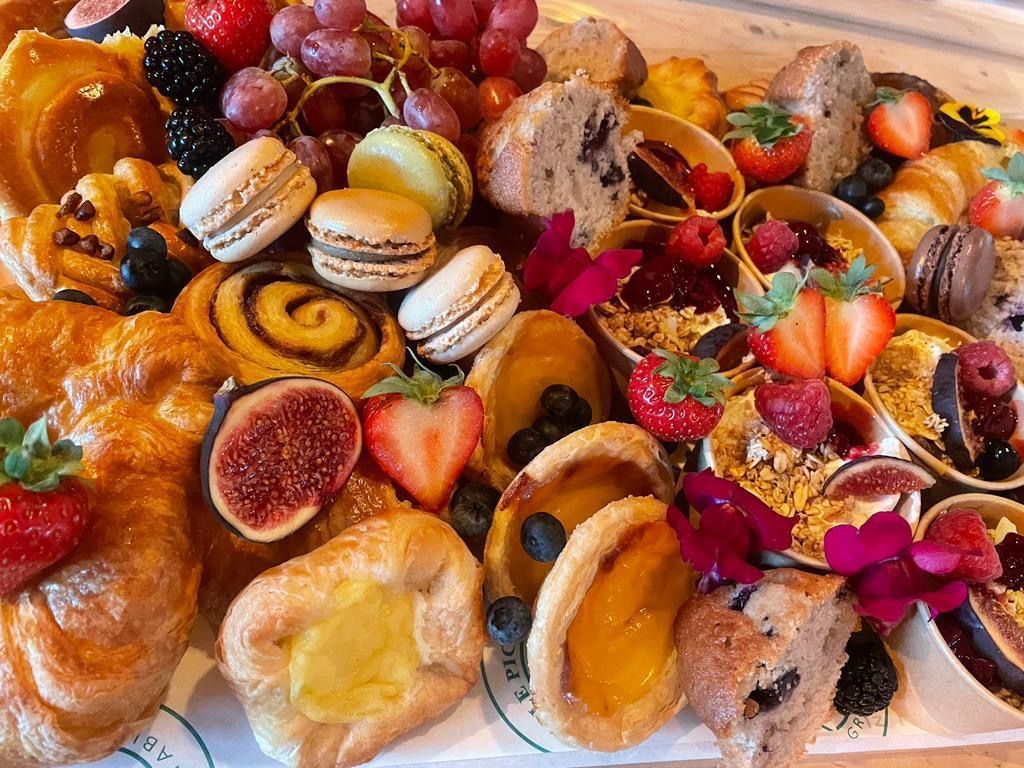 - A selection of freshly baked pastries, fluffy pancakes, brioche vanilla swirls, pasteis de nata and waffles with salted caramel drizzle